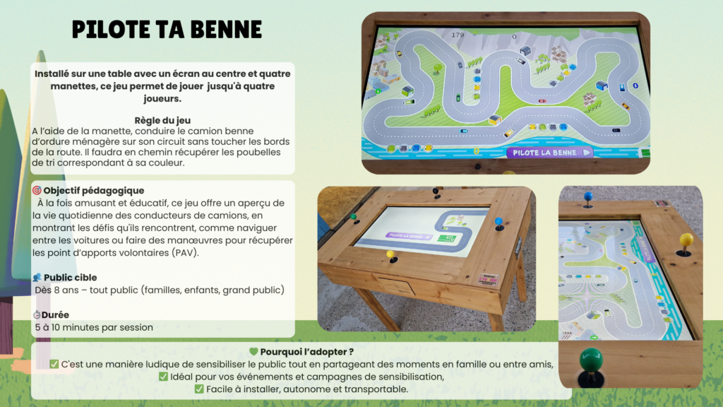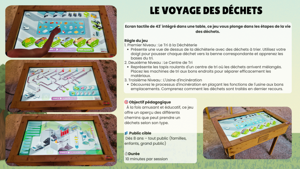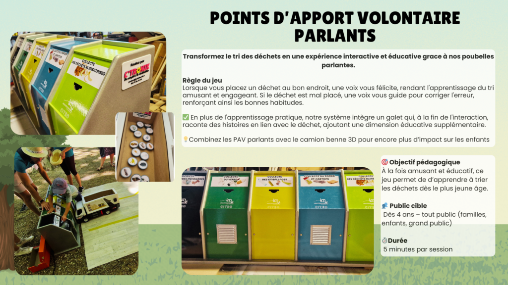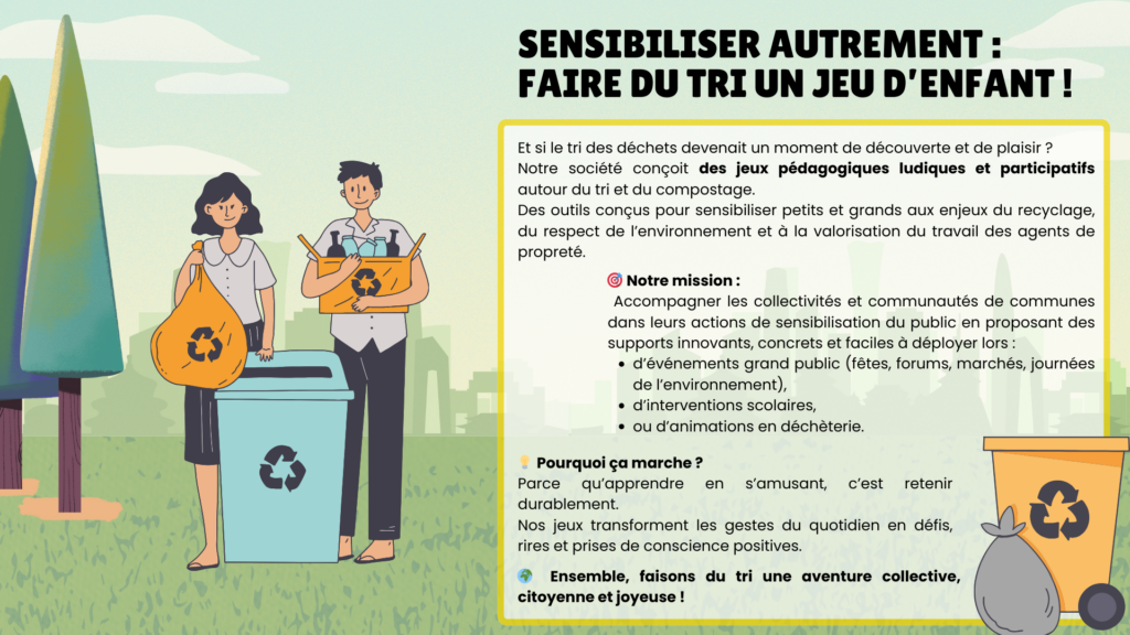 Pensés pour les collectivités, les écoles et les événements grand public, nos dispositifs rendent le tri simple, concret et accessible à tous, dès le plus jeune âge. Jeux numériques, expériences immersives et supports manipulables permettent de mieux comprendre le parcours des déchets et l’importance des bons gestes au quotidien.
